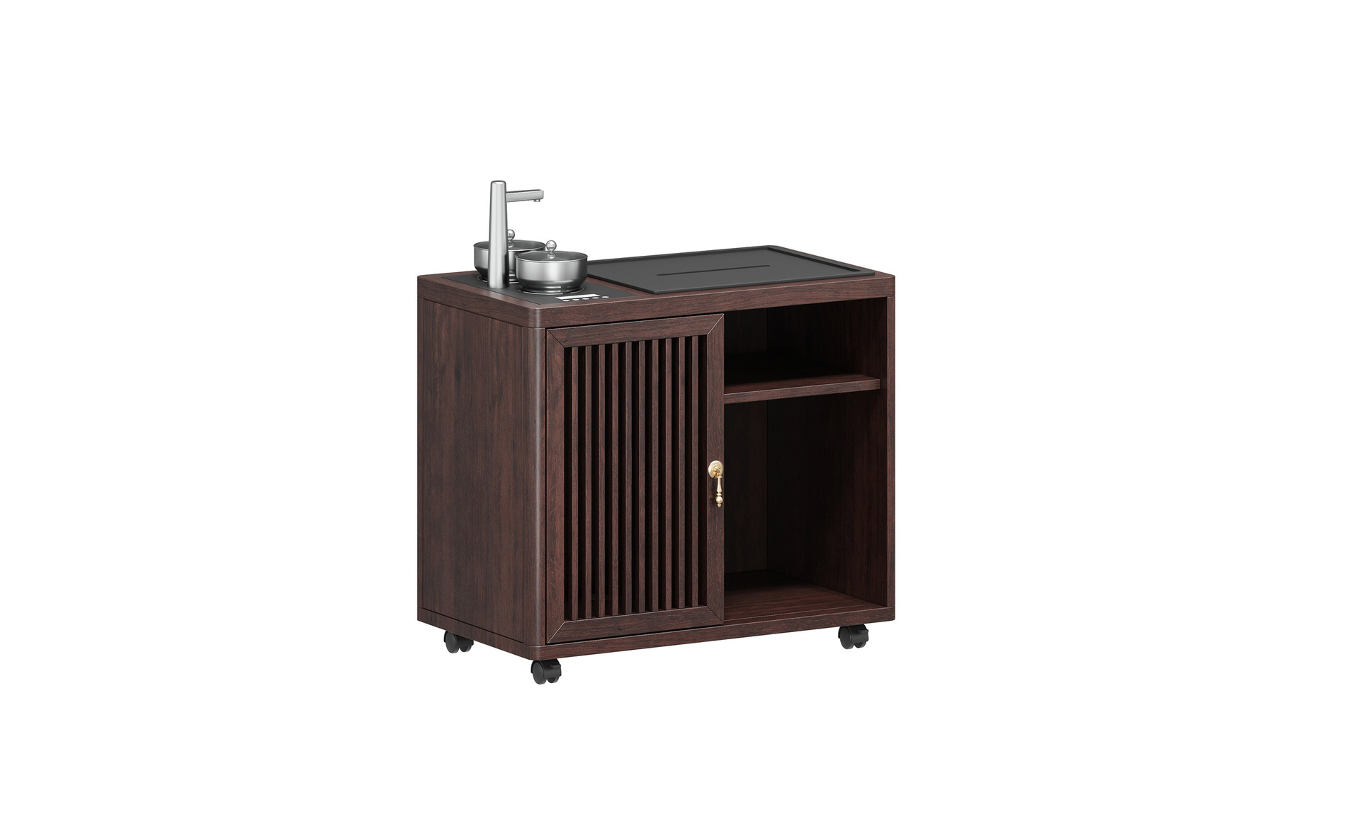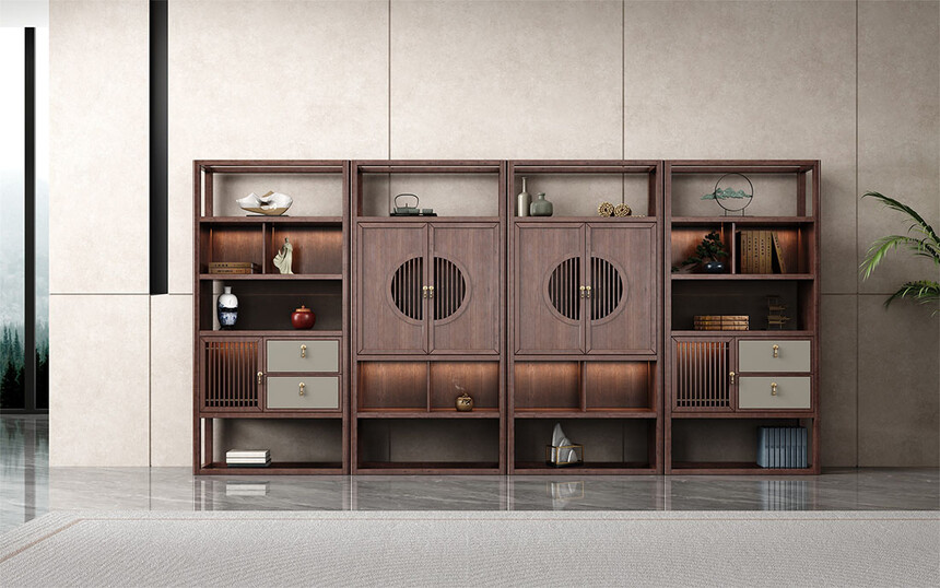 挡板圆型设计,金铜件装饰,铜木结合,镂空竖条元素的原木栅格设计,凸显中式与现代的融合韵味。